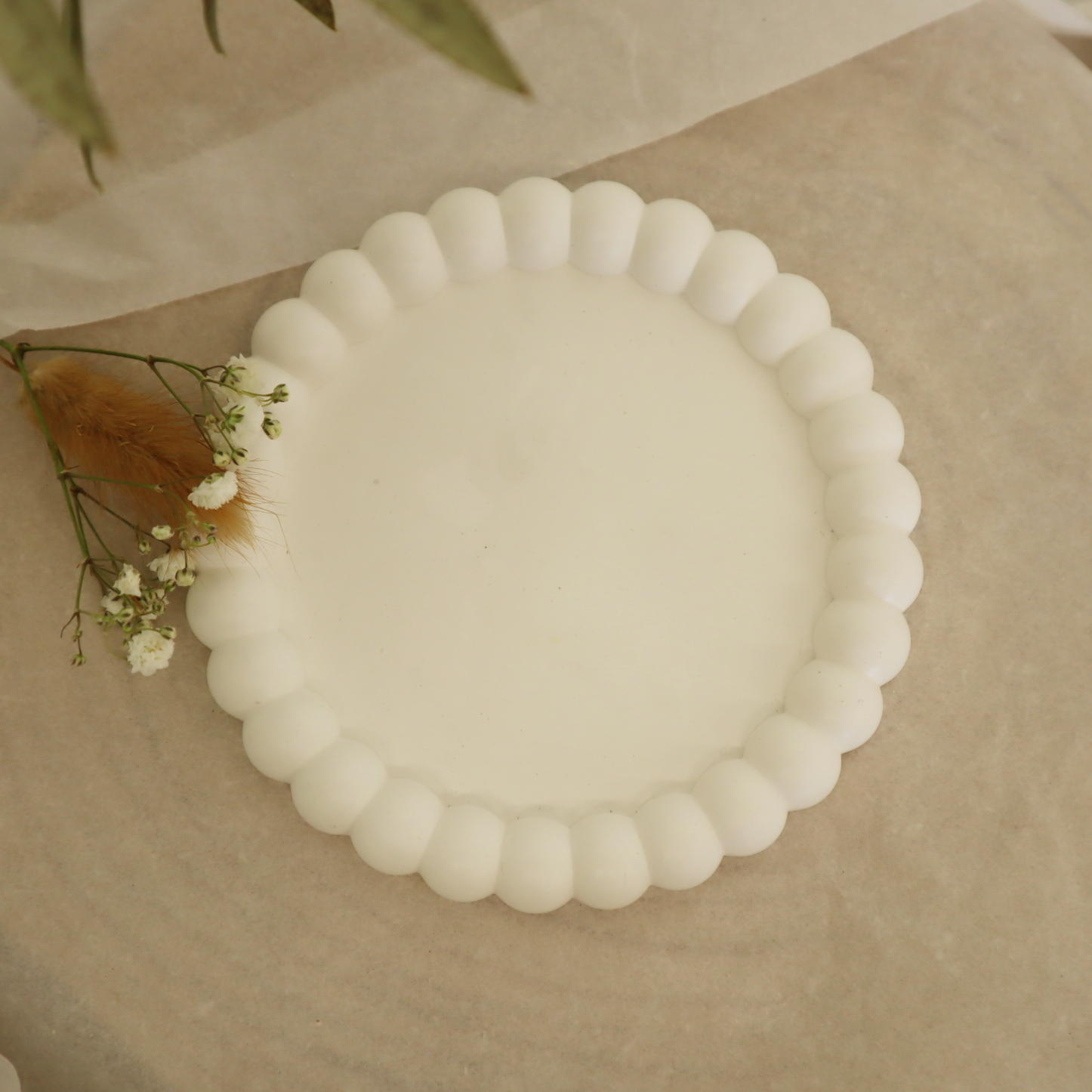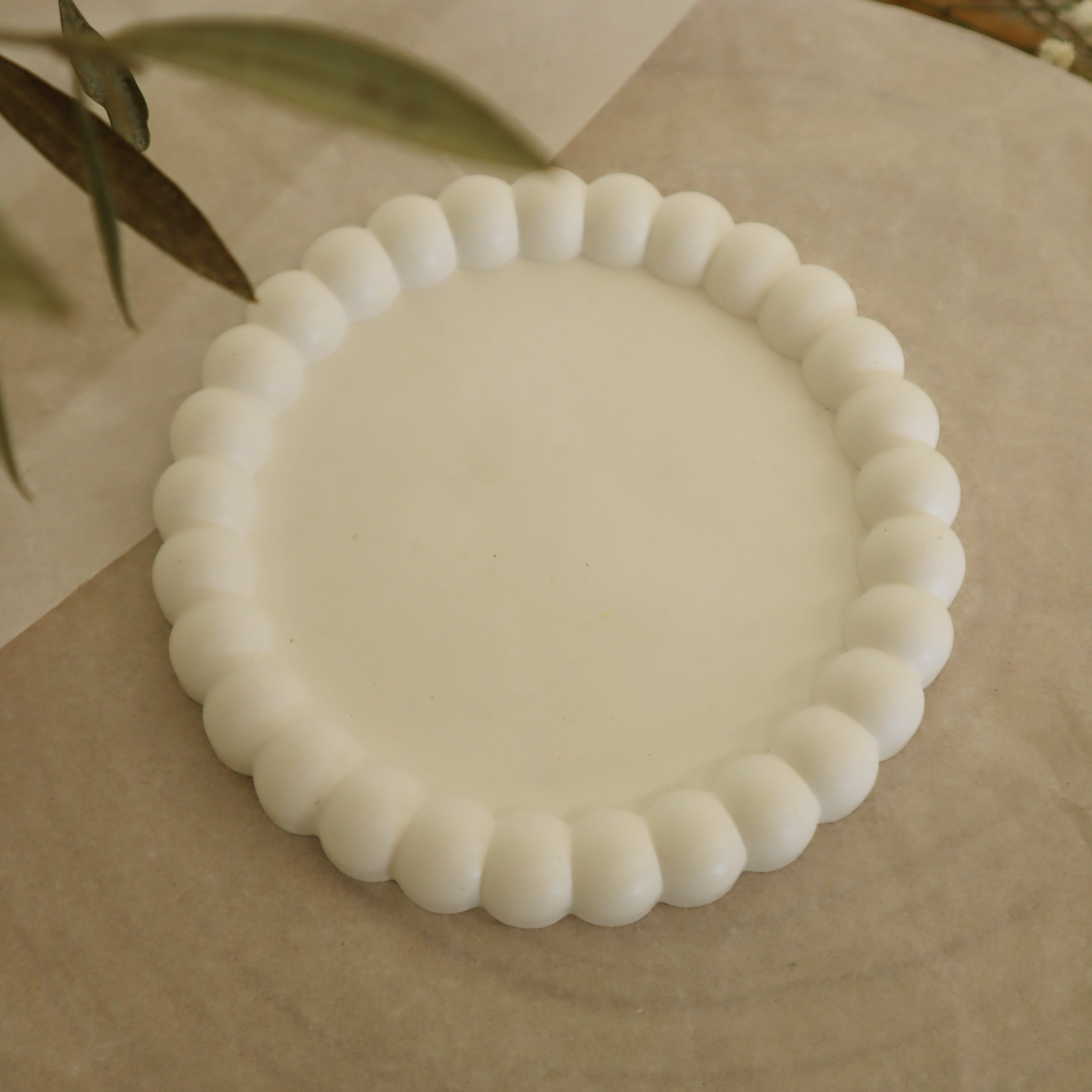Base decorativa Bubble produzida em gesso cerâmico. Seu design redondo com bordas em formato de bolhas traz um toque moderno e delicado para qualquer ambiente. Ideal para apoiar velas, difusores, joias ou pequenos objetos decorativos, combinando funcionalidade e charme minimalista.