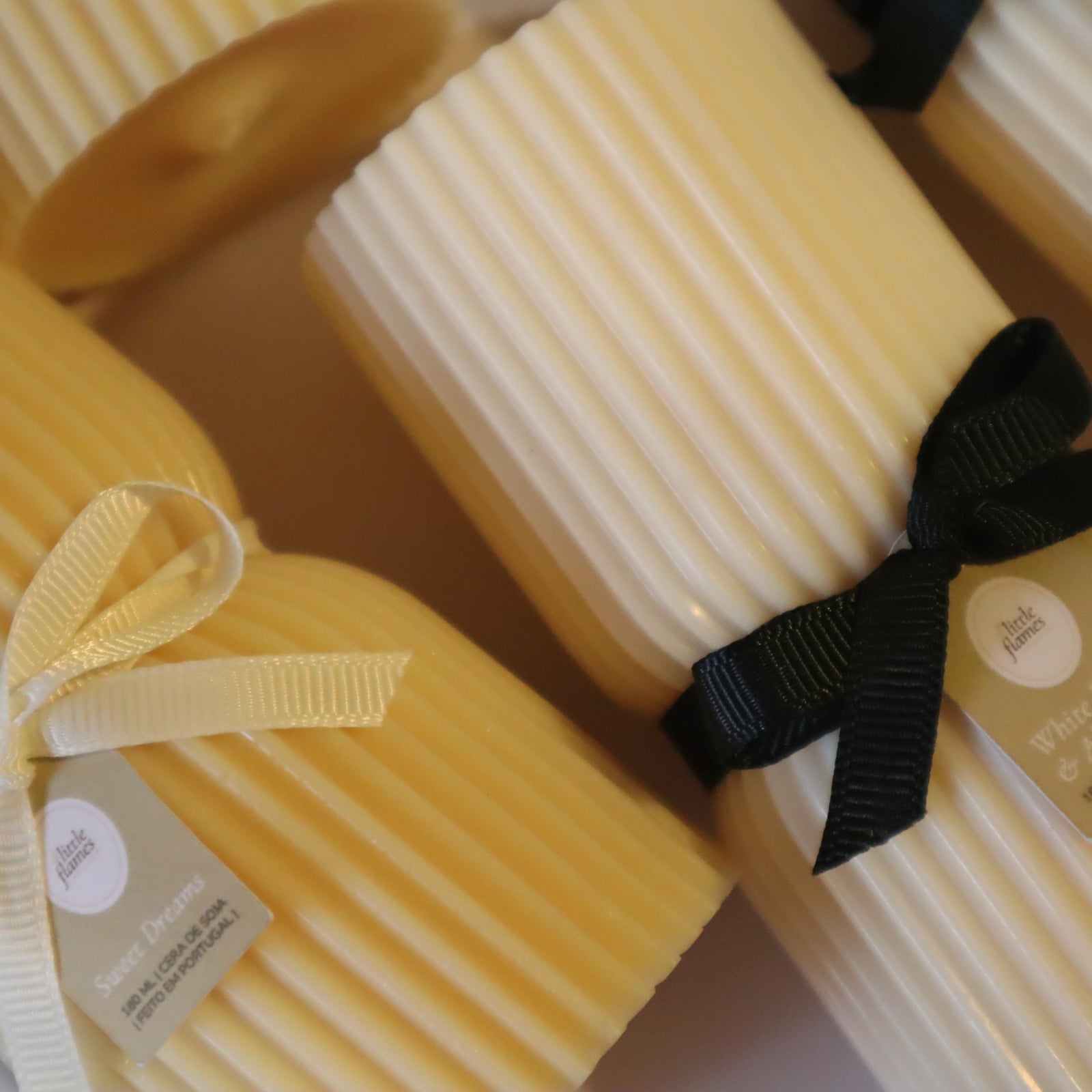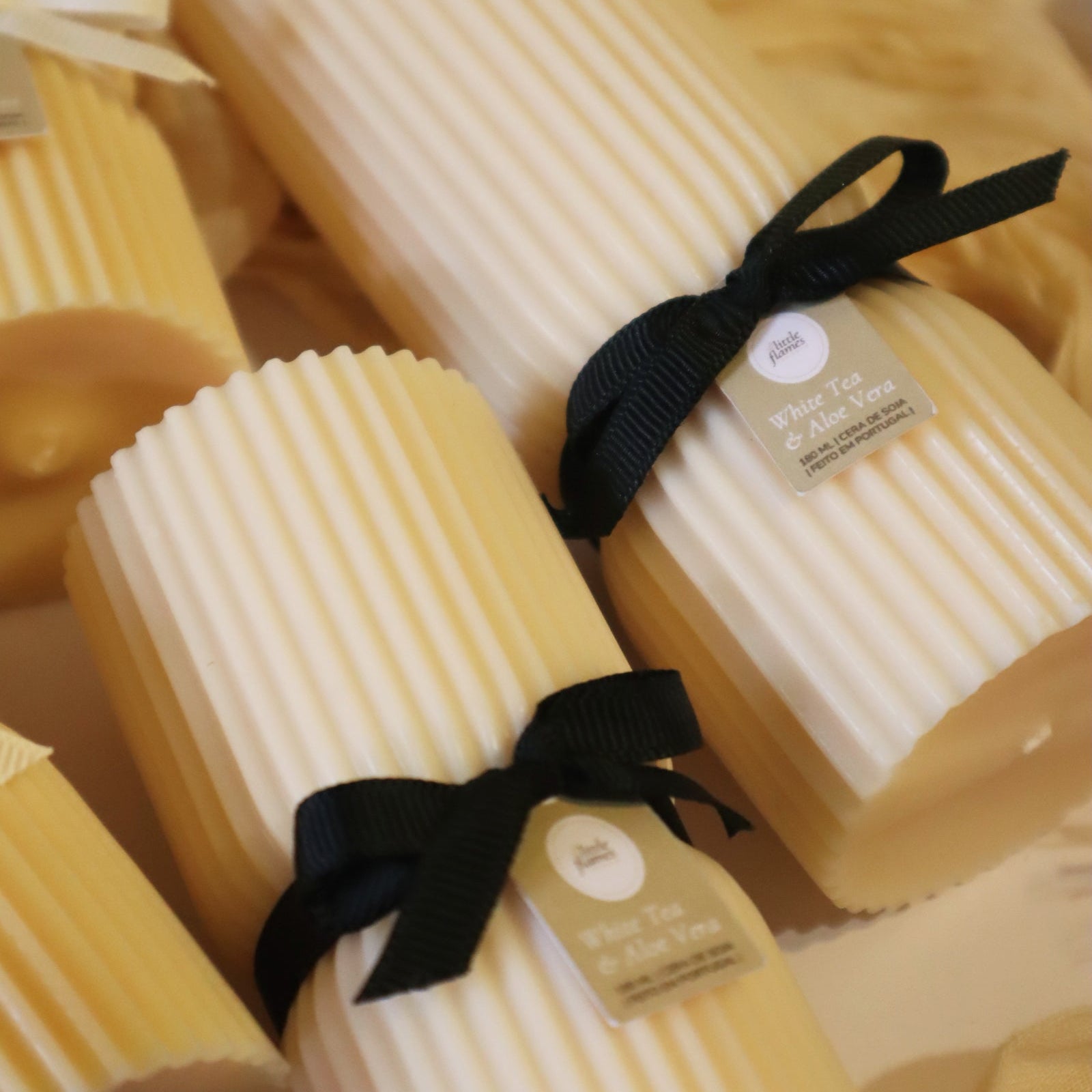 A opção de caixa-presente das velas inclui uma caixa kraft ou branca, com etiqueta, papel de seda branco (ou de outra cor) e um laço de fita de gorgurão em cor a condizer.